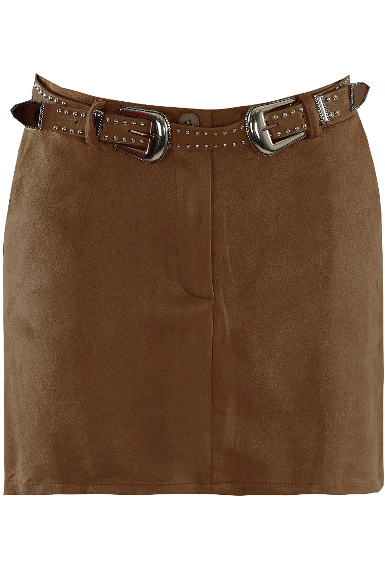 Introducing our Faux Suede Skort, with a studded belt for added style. Made from high-quality faux suede material, it offers both comfort and durability. The perfect addition to any wardrobe, this skort gives the appearance of a skirt with the convenience of shorts. Upgrade your outfit with this fashionable and versatile piece.